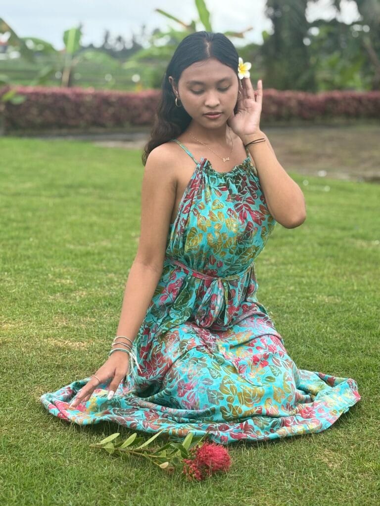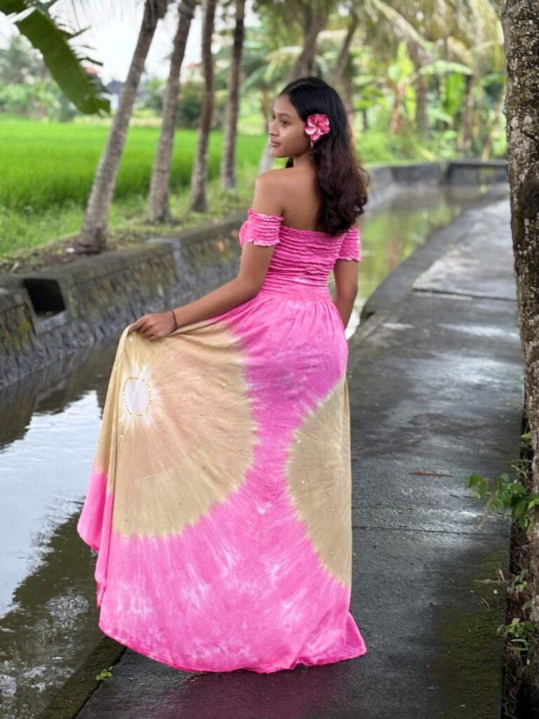 A kollekcióink színeit tudatosan választjuk: a petrolkék és a türkiz az óceán mélységét és tisztaságát idézi, az arany a nap meleg ragyogását hordozza, míg a piros, a rózsaszín és a lila a balinéz naplementék lágy, vibráló fényeit tükrözi. A zöld a lüktető rizsföldek élő energiáját hozza el minden darabba.