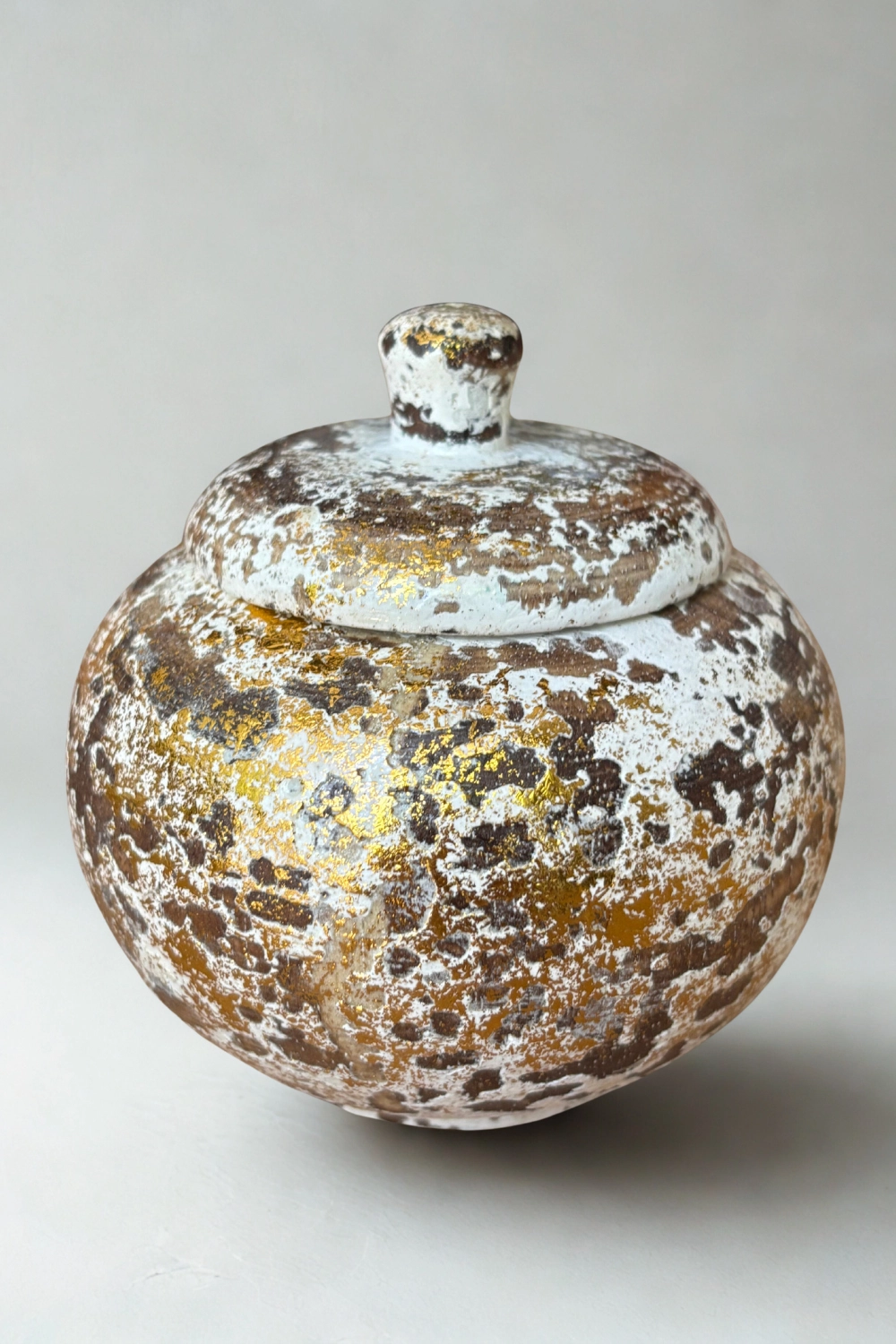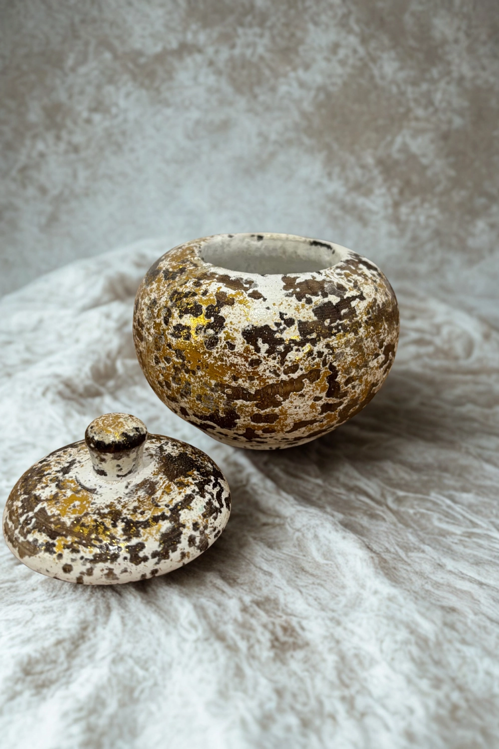 nem csupán praktikus tárgy, hanem egy elegáns, spirituális jelenlét, amely fényt visz a mindennapokba. A természetes fából készült, kézzel faragott tárolók finoman aranyozott felületükkel a nap melegét és a belső ragyogást idézik meg. Textúrájuk rusztikus, mégis kifinomult – mintha a természet és az emberi kéz közösen alkotta volna őket. A lekerekített forma, a finom fedélgomb és az arany patina mind azt sugallják: itt minden apróság méltó figyelmet kap.