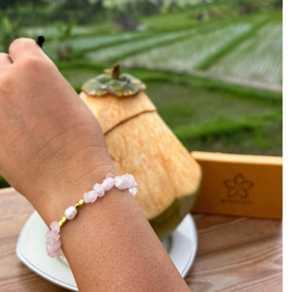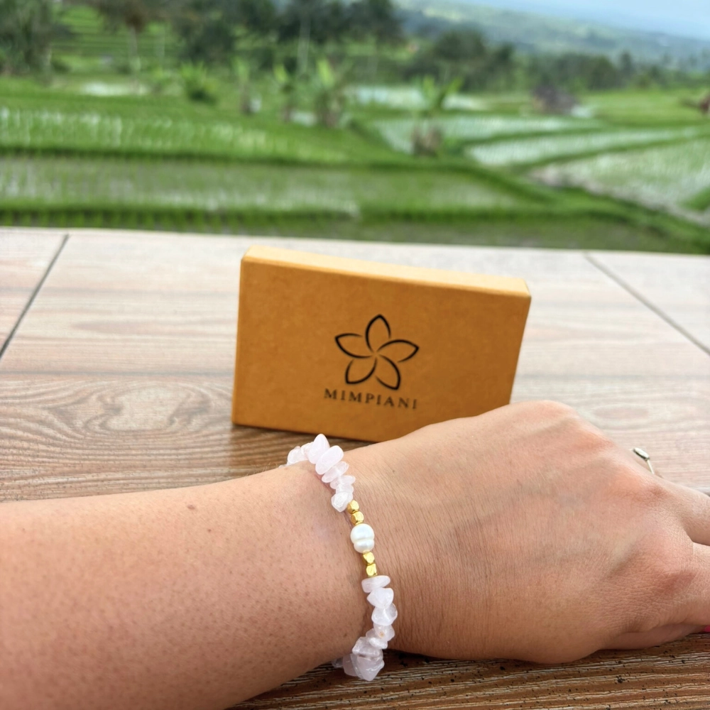 Fenntarthatóság és tudatosság From Ayuni rózsakvarc karkötő 100%-ban kézzel készült, etikus kereskedelem keretében Balin. A természetes rózsakvarc és az édesvízi igazgyöngy felhasználása a tudatos anyaghasználatot tükrözi. A karkötőt spirituálisan megtisztítva és balinéz papok által megszentelve küldjük.