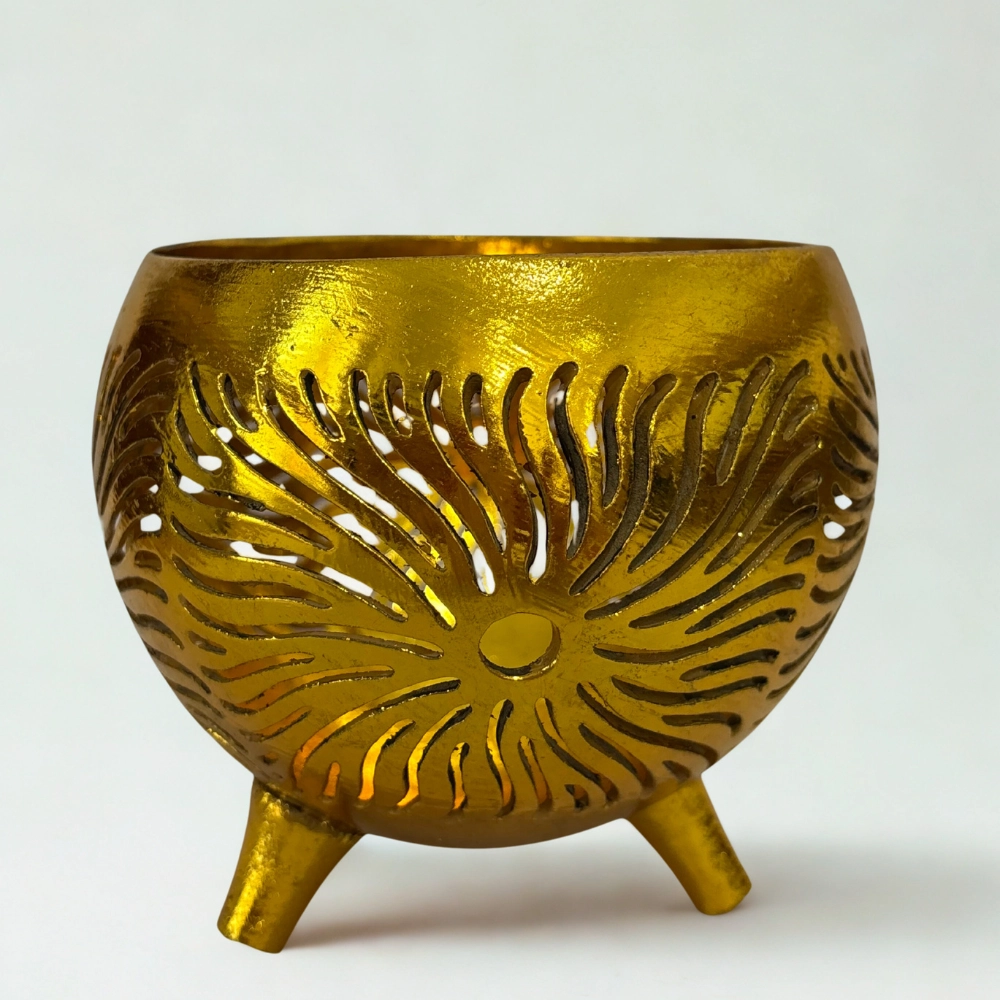 Kézzel készült, dekoratív mécsestartó, amely a nap szimbolikáját és az arany ragyogást ötvözi. A test gömbölyded, három apró lábon áll, stabilan és elegánsan. A felületet sugárirányú, lángszerű áttört minták díszítik, amelyek egy középpontból indulnak ki – mintha a nap fénye áradna szét minden irányba. A teljes külső felületet fémes aranyszín borítja, amely a mécses fényét megsokszorozza, visszatükrözi és szinte élővé teszi.