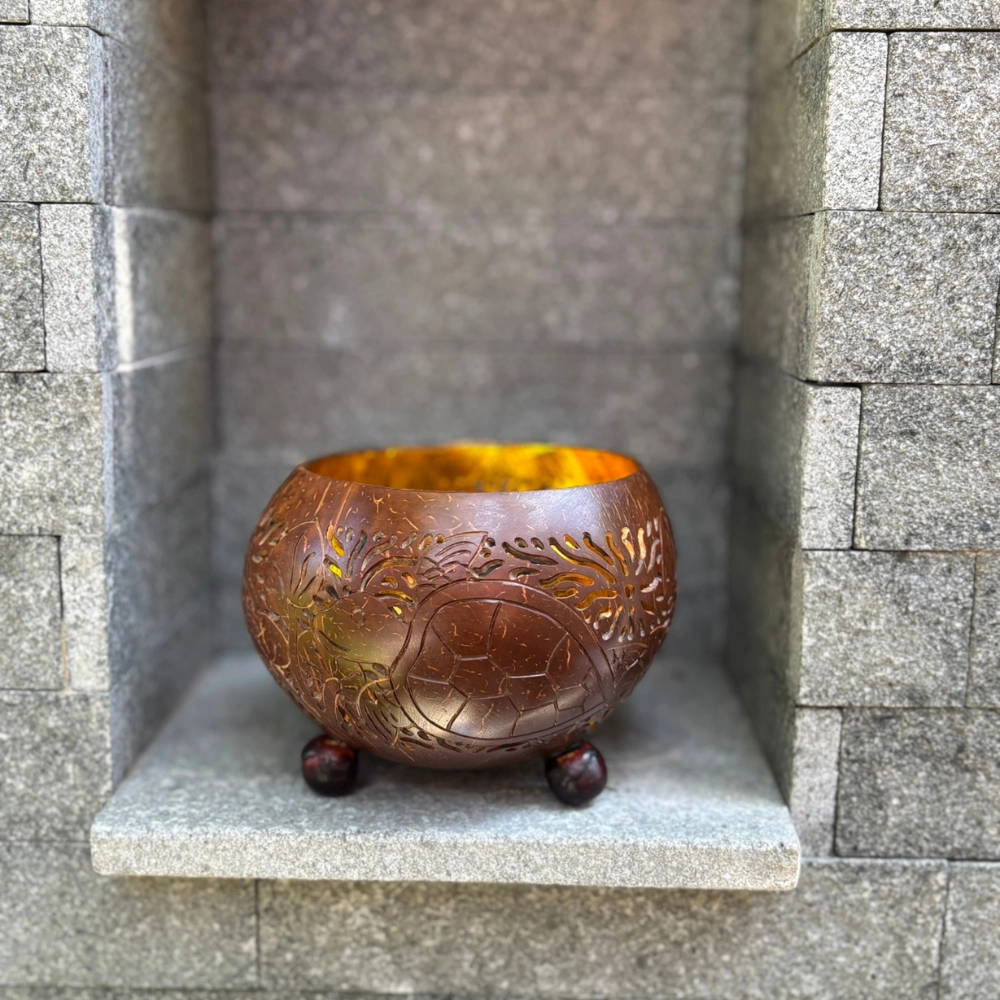 Egy különleges, kézzel faragott mécsestartó, amely a teknősbéka szimbólumát és a trópusi motívumokat hozza el az otthonba. A test gömbölyded, három apró lábon áll, stabilan és elegánsan. A külső felületet sötétbarna, natúr kókuszhéj textúra jellemzi, míg a belső rész aranyszínűre festett, így a mécses fénye meleg ragyogással tölti meg a teret ✨. A faragásban pálmalevél motívumok és egy teknősbéka alak jelenik meg – a lassú, megfontolt haladás, a belső béke és az időtálló bölcsesség jelképeként. A fény áttör a mintákon, és organikus, mesélő árnyékokat rajzol a környezetbe.