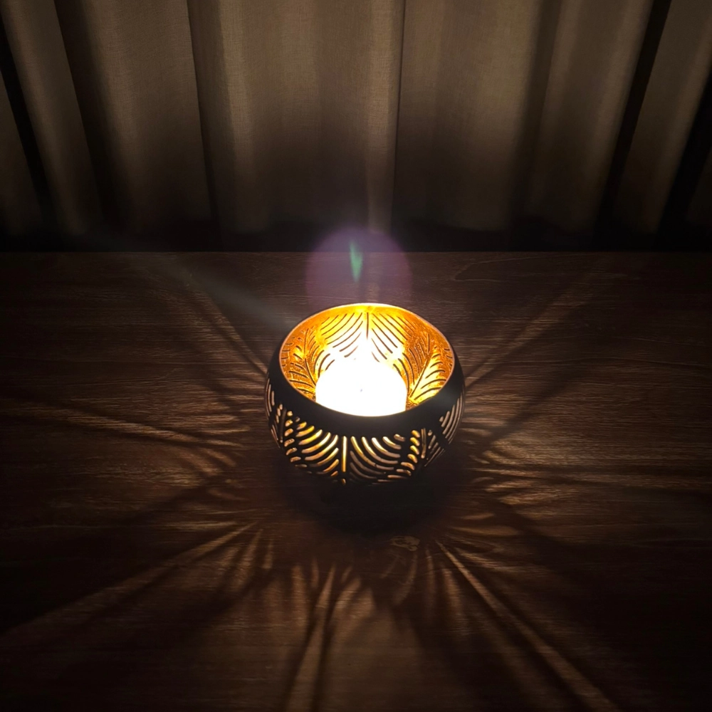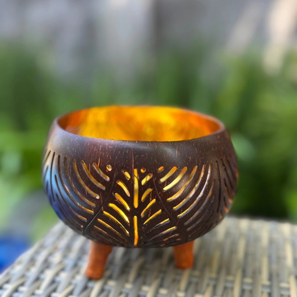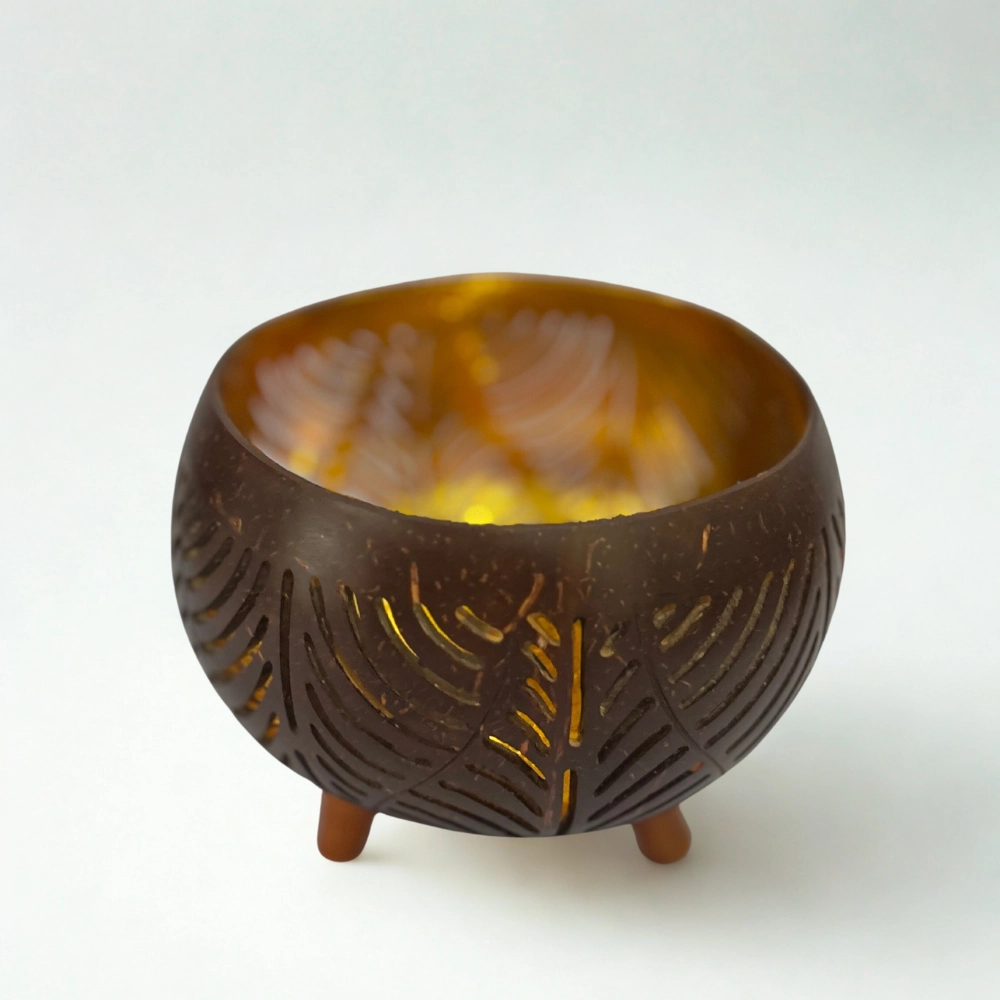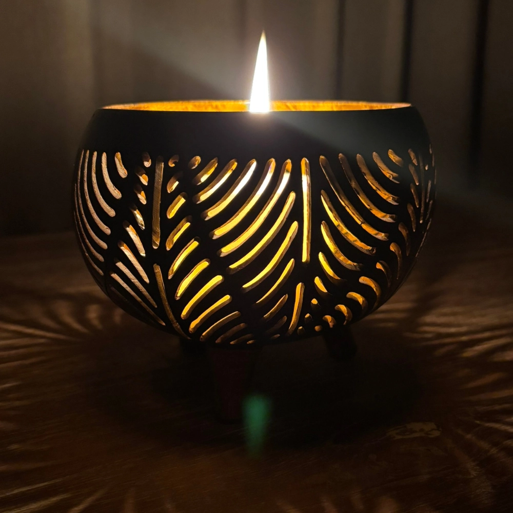 Kézzel készült, dekoratív mécsestartó, amely a kókuszhéj eredeti textúráját és a levélmintás áttört motívumokat ötvözi. A test gömbölyded, három apró lábon áll, stabilan és elegánsan. A külső felületet sötétbarna, natúr árnyalat jellemzi, míg a belső rész aranyszínűre festett, így a mécses fénye meleg ragyogással tölti meg a teret ✨. A levélmintákon átszűrődő fény organikus árnyékokat rajzol, mintha a természet lélegezne az otthonban.