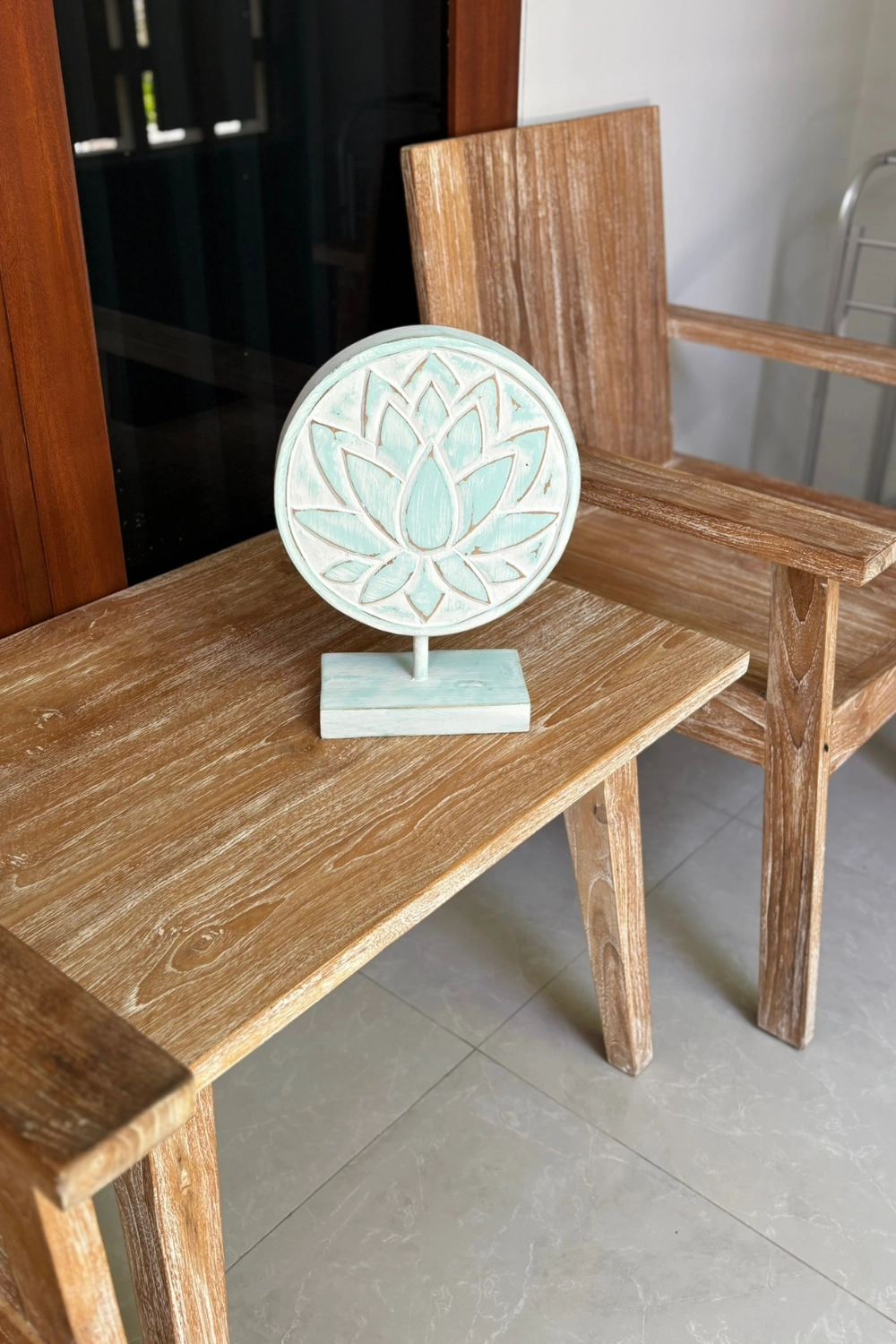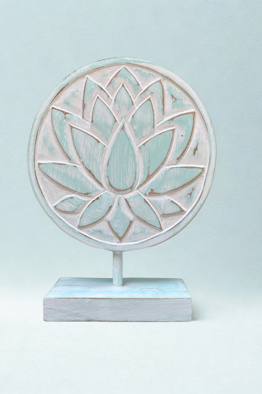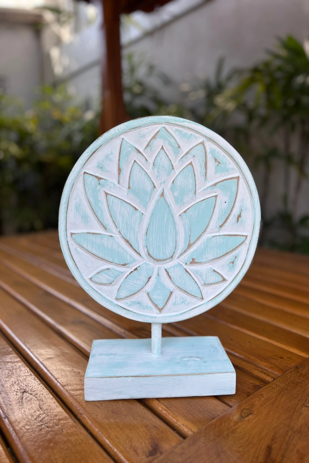 amely a tisztaság, megújulás és spirituális fejlődés szimbóluma. A kör alakú panelbe mélyen vésett szirmok egy nyíló lótuszt idéznek – azt a pillanatot, amikor a lélek megérkezik a belső békéhez. A világos, fehér és türkiz árnyalatokkal festett felület rusztikus, vintage hatást kelt, mintha a természet és az idő közösen formálták volna. A dísz egy álló talapzatra van rögzítve, így könnyedén elhelyezhető polcon, komódon vagy oltáron. A Lotara nem csupán dekoráció, hanem emlékeztető: a szépség belülről fakad, és minden nap újra kivirágozhat 🪷.