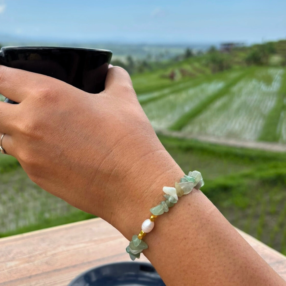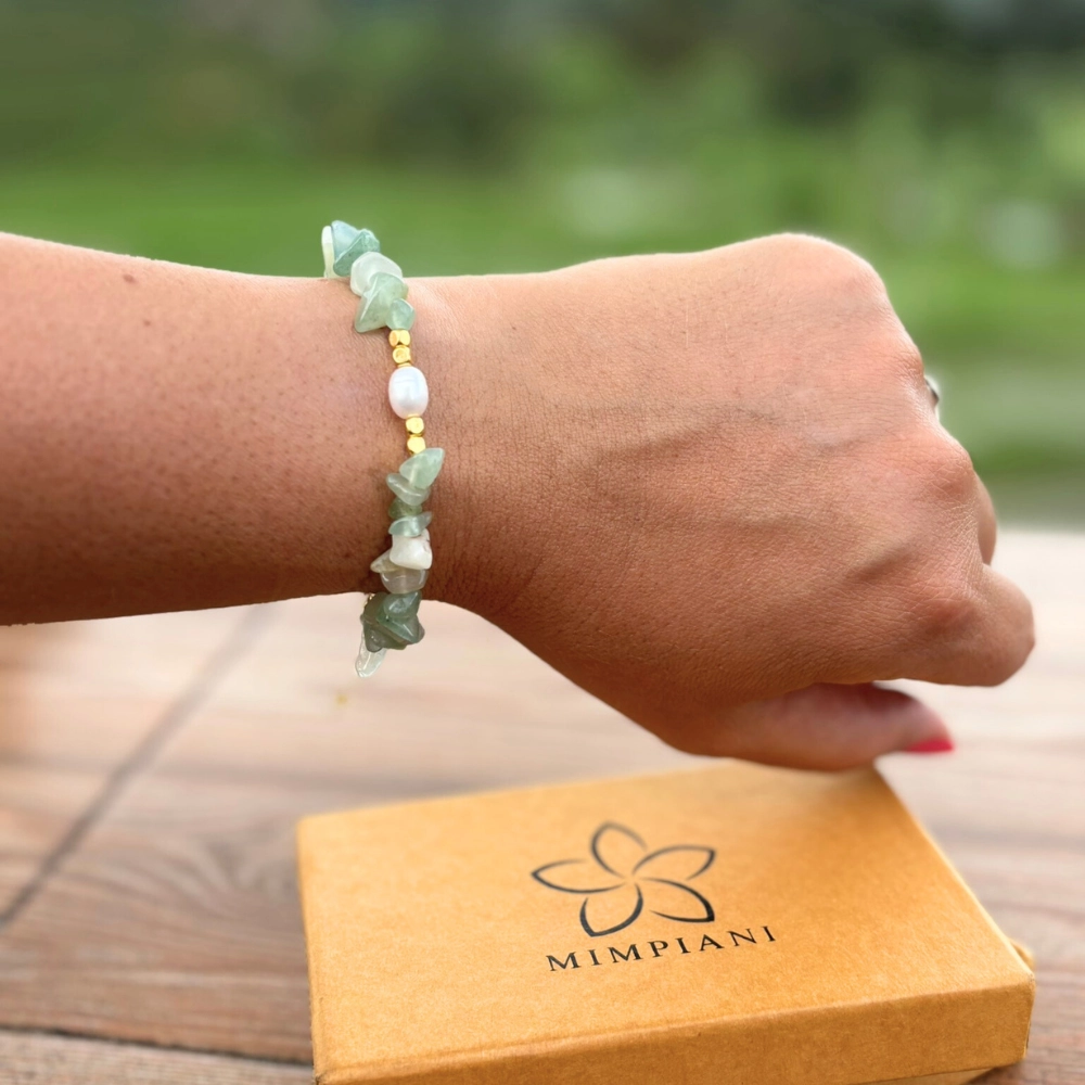 A Sukma balinéz nyelven lelket jelent — ez a karkötő pedig valóban a belső világodhoz szól. Kézzel fűzött aventurin kövek, aranyszínű részletek és egyetlen igazgyöngy találkozása egy szertartásos pillanatban született meg, Balin, ahol minden darab megszentelésre kerül. Az ékszer nem csupán díszít, hanem emlékeztet: a nyugalom, a védelem és a belső fény mindig veled lehet. Az aventurin a nyugalom köve. Finom zöld árnyalata a természet harmóniáját idézi, miközben segíti a belső egyensúly megtalálását. Úgy tartják, hogy támogatja a szív energiáját, és segít megnyílni az öröm felé. Az igazgyöngy pedig a tisztaság és a nőiesség szimbóluma, amely csendes eleganciát és mélységet közvetít.