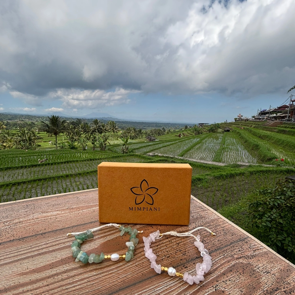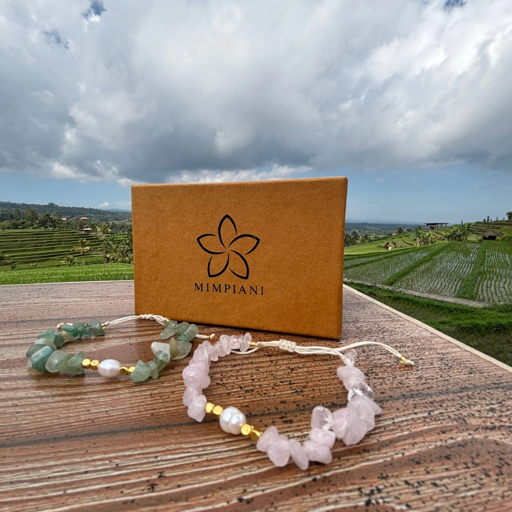 Fenntarthatóság és tudatosság A Sukma karkötő 100%-ban kézzel készült, etikus kereskedelem keretében Balin. A természetes édesvízi igazgyöngy és az aventurin ásványok, valamint a prémium minőségű, rugalmas zsinór mind a tudatos anyaghasználatot tükrözik. Különlegessége, hogy balinéz papok által megszentelve érkezik.