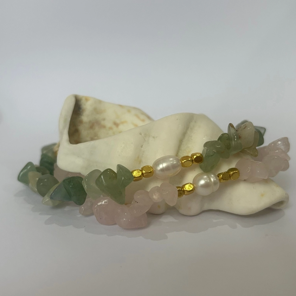 - Materials: Aventurin ásványok, 1 db édesvízi igazgyöngy, aranyszínű fém köztesek, rugalmas zsinór.