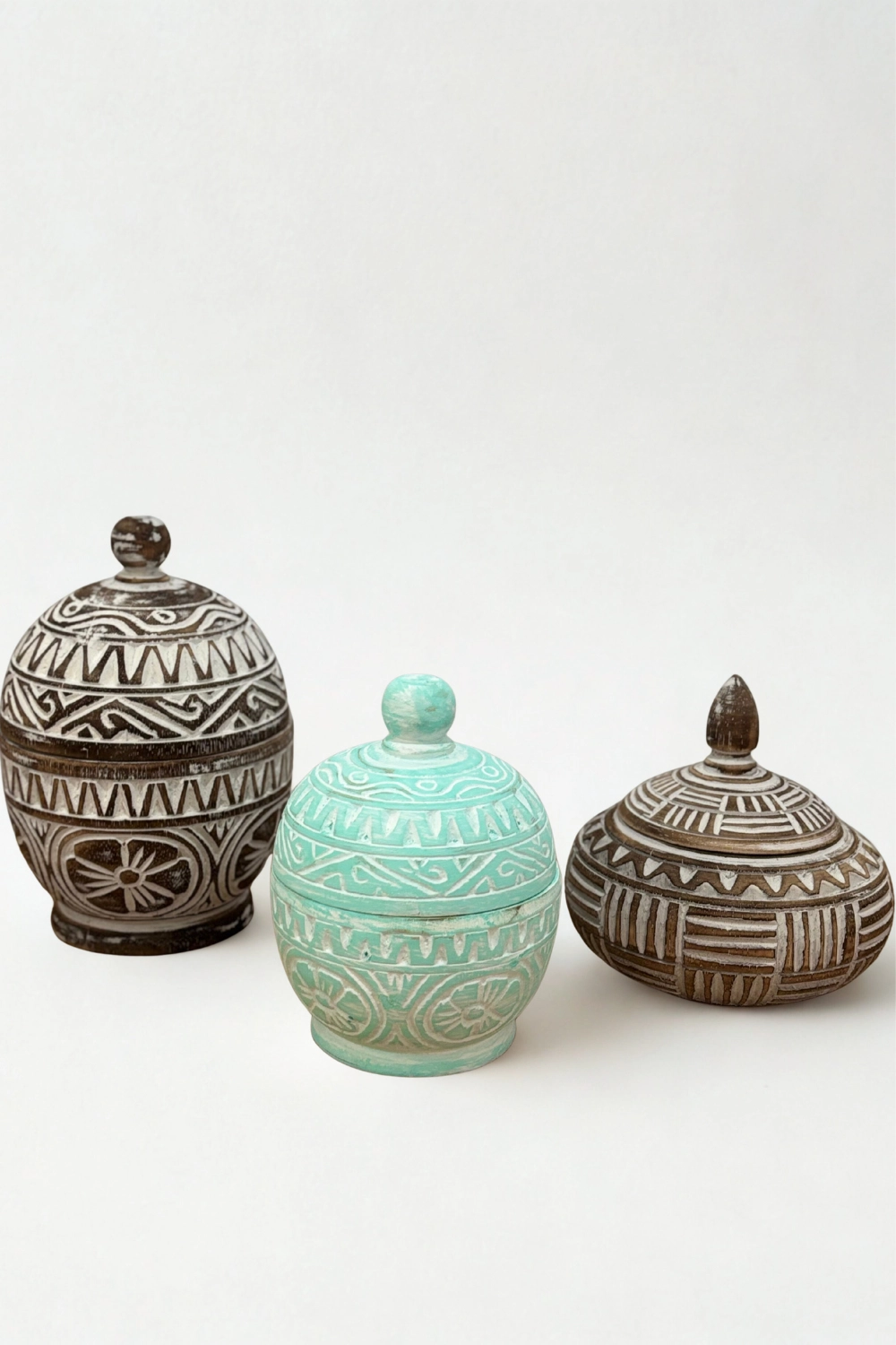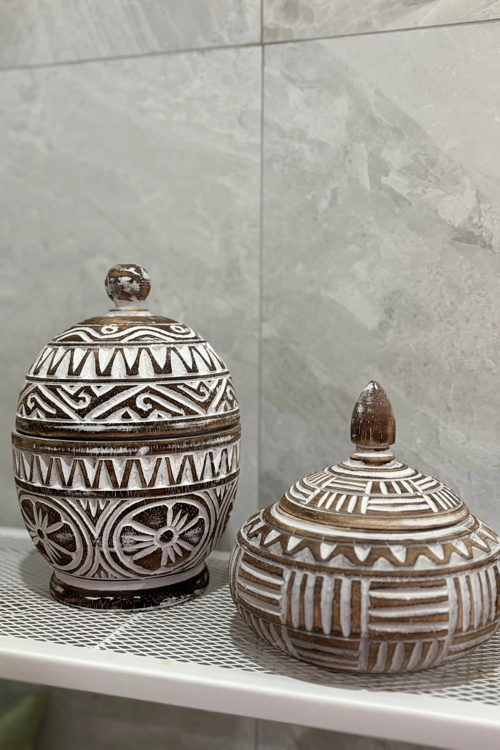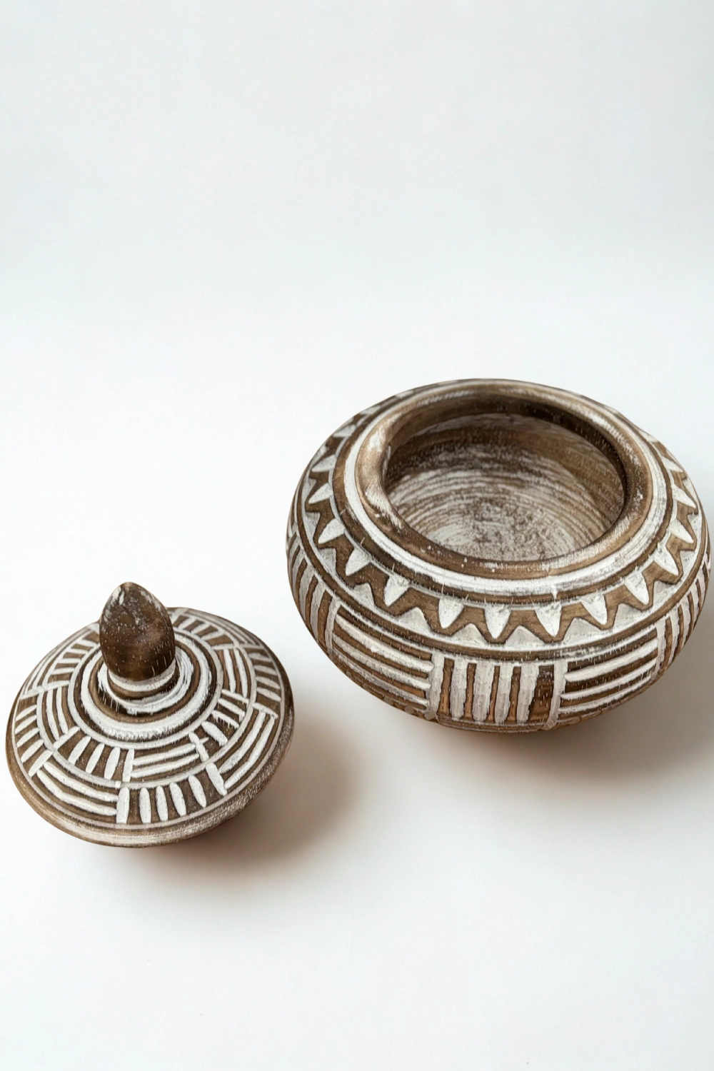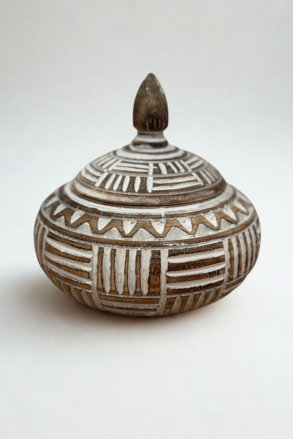 Kézzel faragott Timera tárolóedény natúr barna árnyalatban, geometrikus mintákkal és hegyes fogantyúval. Ideális ékszerek vagy dekoráció tárolására. A hagyományos formák és földszínek harmóniája.