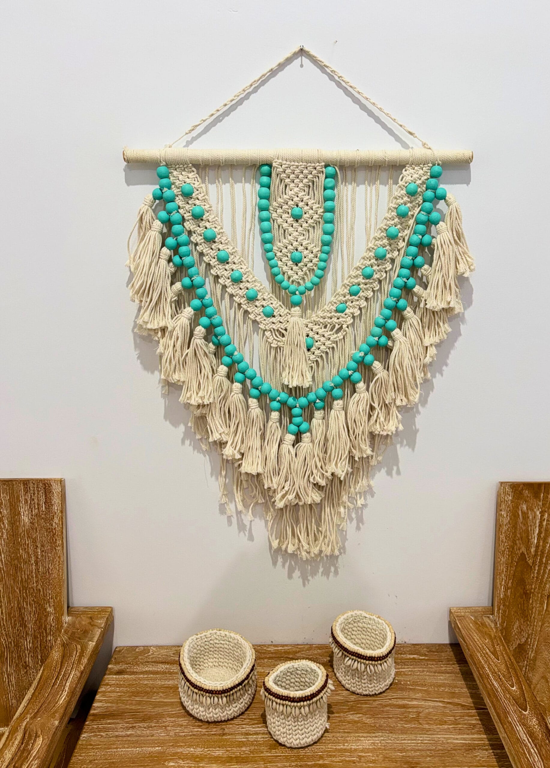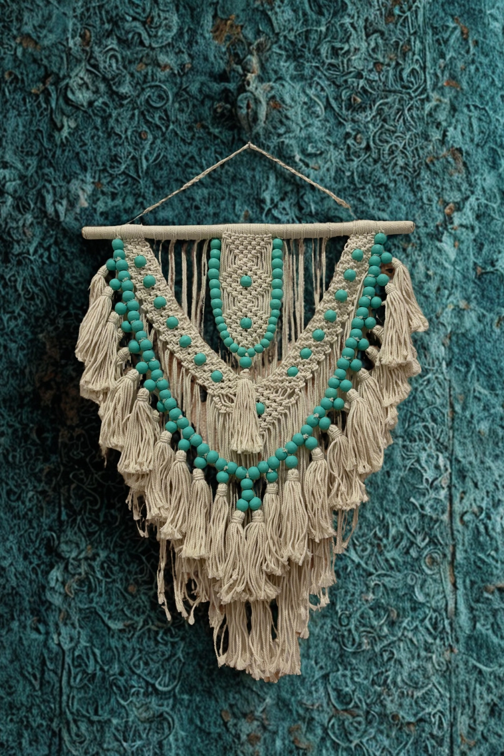 egy kézzel csomózott fali dísz, amely a víz energiáját és a belső tisztulás szimbolikáját hozza el a térbe. A természetes pamutfonalból készült, krémszínű alapot finoman elhelyezett türkiz gyöngyök díszítik – mintha apró vízcseppek csillannának meg a fonalak között. A rétegzett rojtok és a szimmetrikus mintázat lágy mozgást idéznek, mintha a szél vagy a víz finoman átsuhanna rajta. A vízhez kapcsolódó türkiz árnyalat a megújulás, érzelmi tisztulás és spirituális védelem színe.