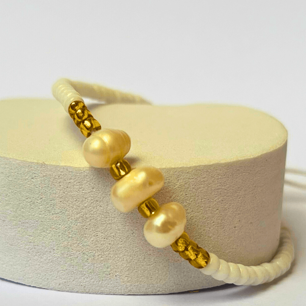 "Cahaya -belső ragyogás" üveggyöngy karkötő igazgyönggyel„Cahaya -belső ragyogás” üveggyöngy karkötő igazgyönggyel