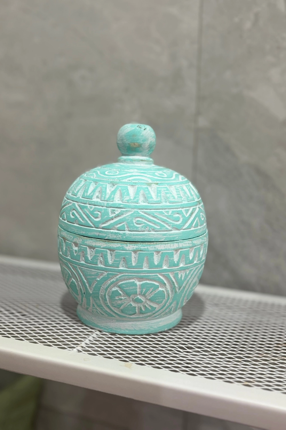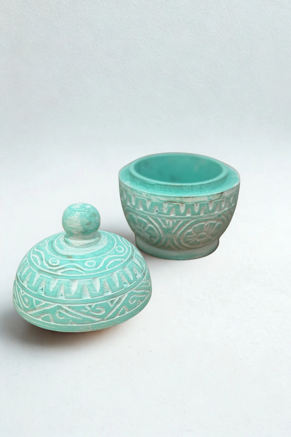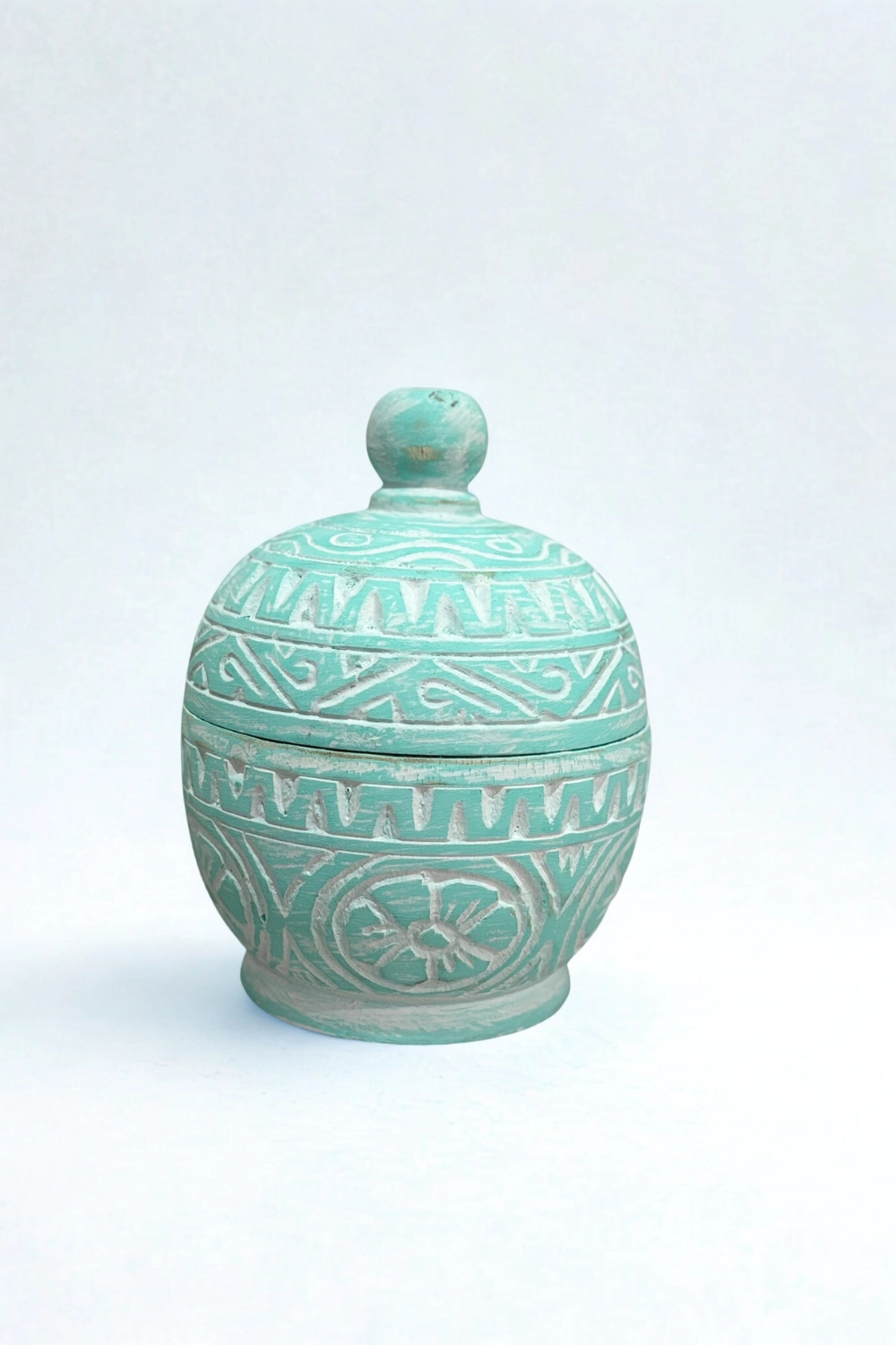 Kézzel faragott Kayara tárolóedény türkiz árnyalatban, geometrikus mintákkal és kupakkal. A nyugalom és a kézművesség lelke, tökéletes ékszerek és apró kincsek tárolására.