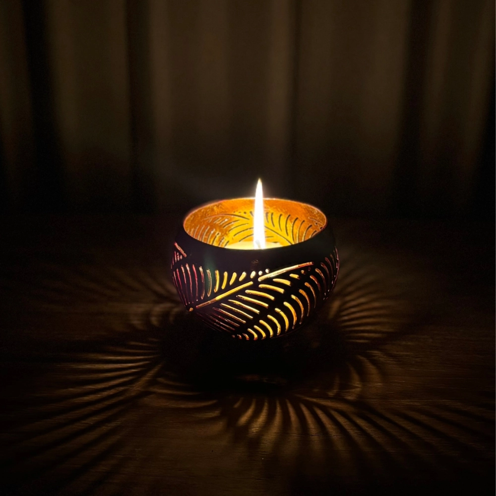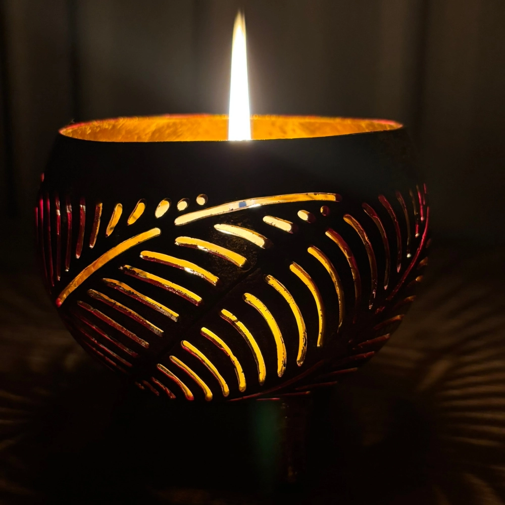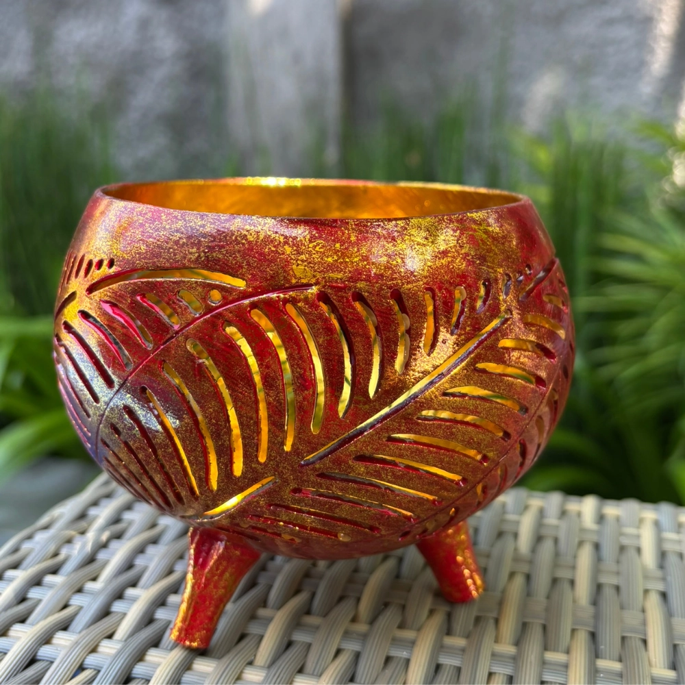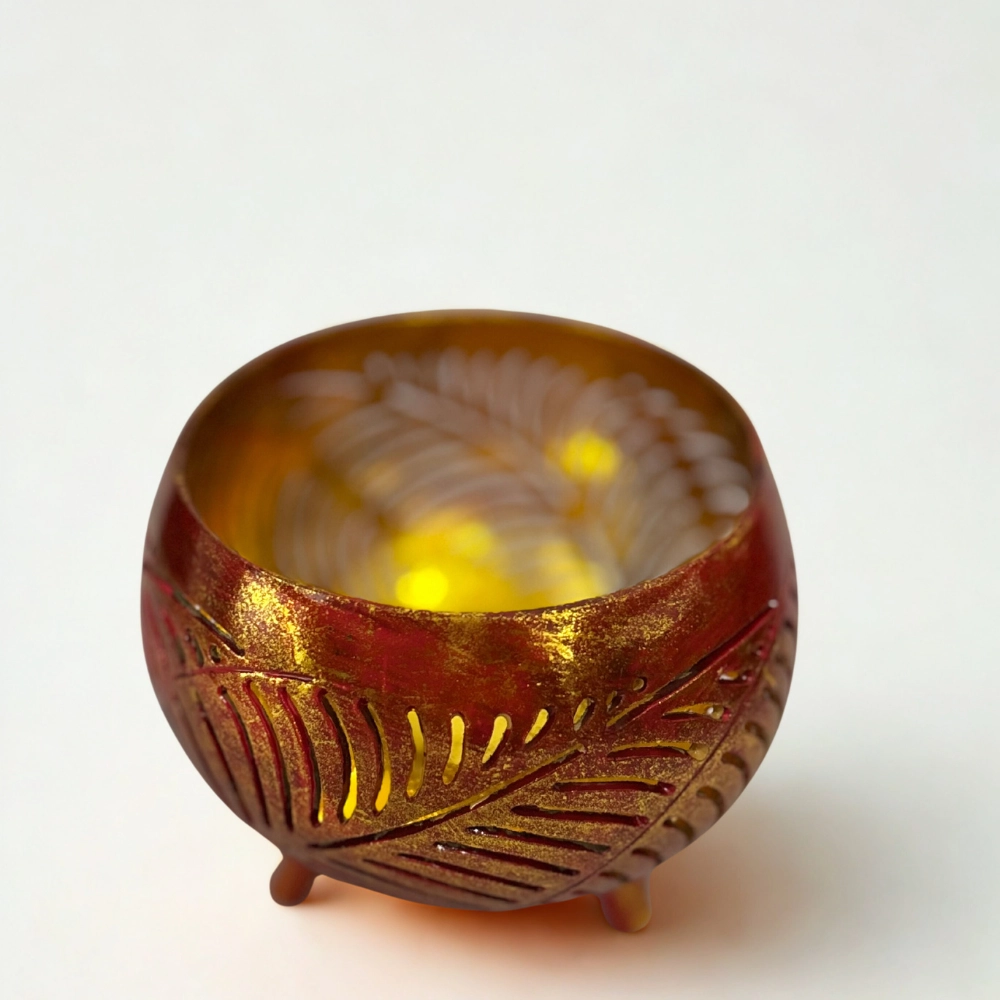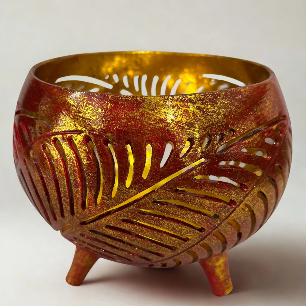 Kézzel faragott mécsestartó természetes kókuszhéjból, piros külsővel és arany csillanásokkal. Levélmintás áttört motívumai meleg, organikus fényhatást keltenek. Ideális ünnepi dekorációhoz.