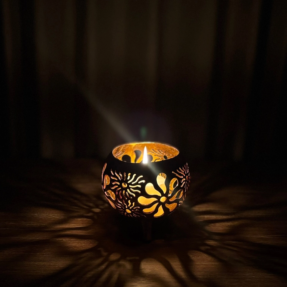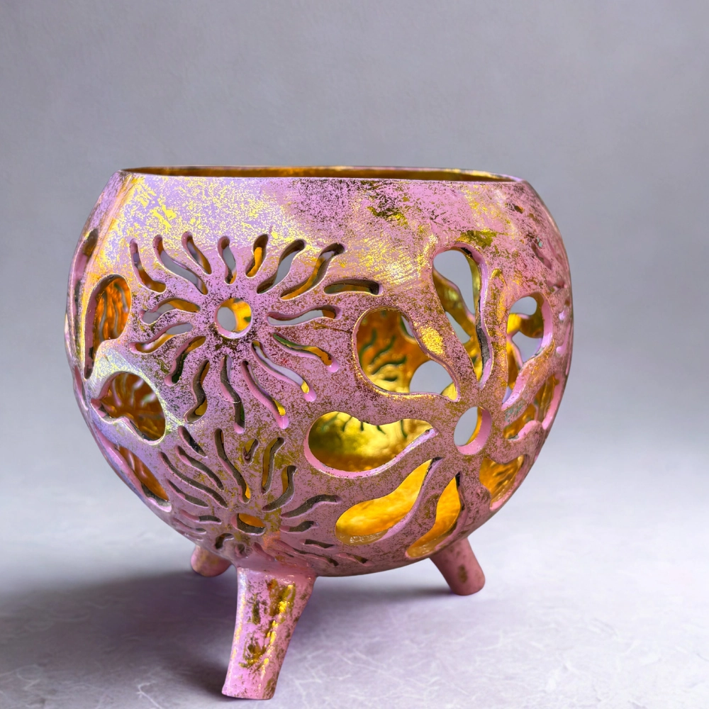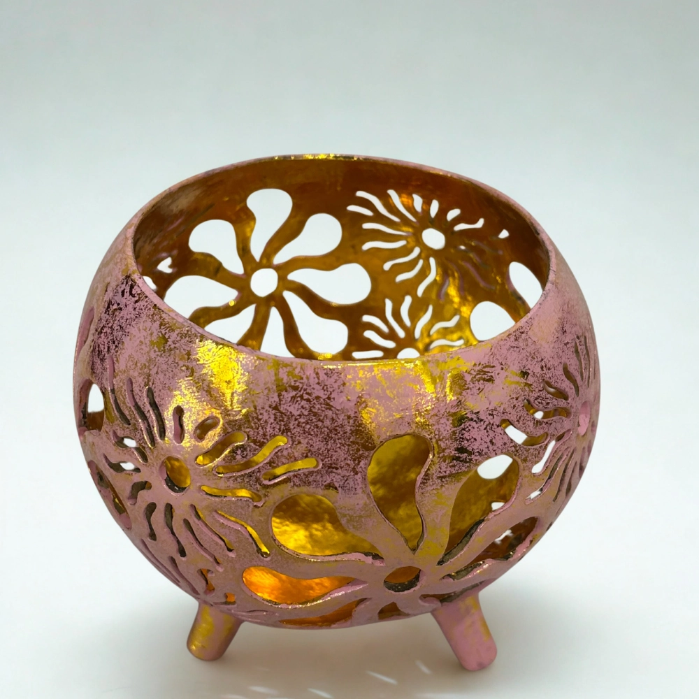 Kézzel készült, dekoratív mécsestartó, amely a kókuszhéj ihlette forma és a virágos áttört mintázat találkozása. A test gömbölyded, három apró lábon áll, stabilan és elegánsan. A külső felületet meleg pink árnyalat borítja, míg a belső rész aranyszínűre festett, így a mécses fénye ragyogóan tükröződik vissza. Ez a Mimpiani világában a merah muda, a fiatal piros színe, amely a gyengédséget és a szerelmet szimbolizálja.A felületet stilizált virágminták és geometrikus perforációk díszítik, amelyek finoman kiszűrik a fényt, varázslatos árnyékokat rajzolva a környezetbe. A forma légies, mégis karakteres – mintha egy virág nyílna ki a fény hatására.