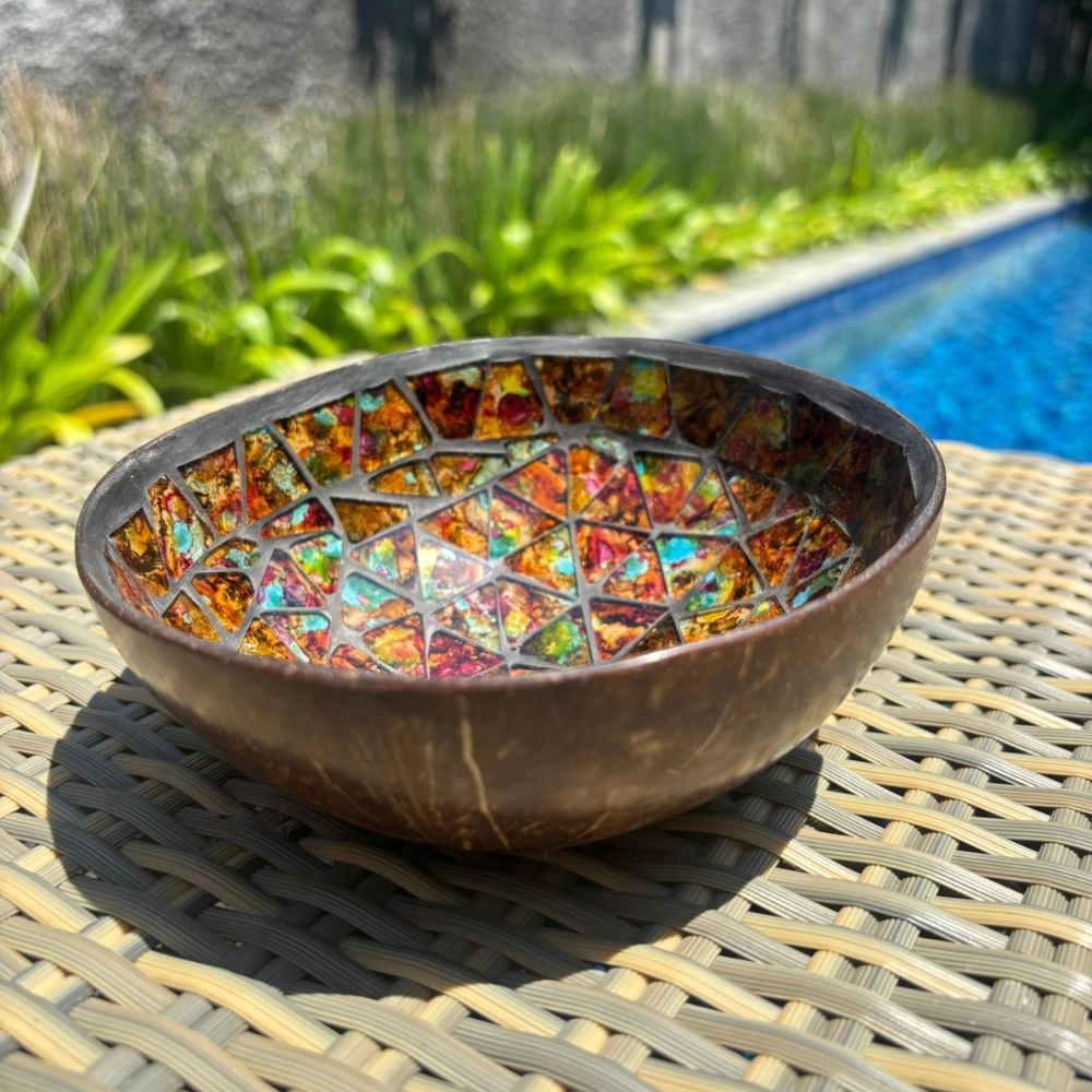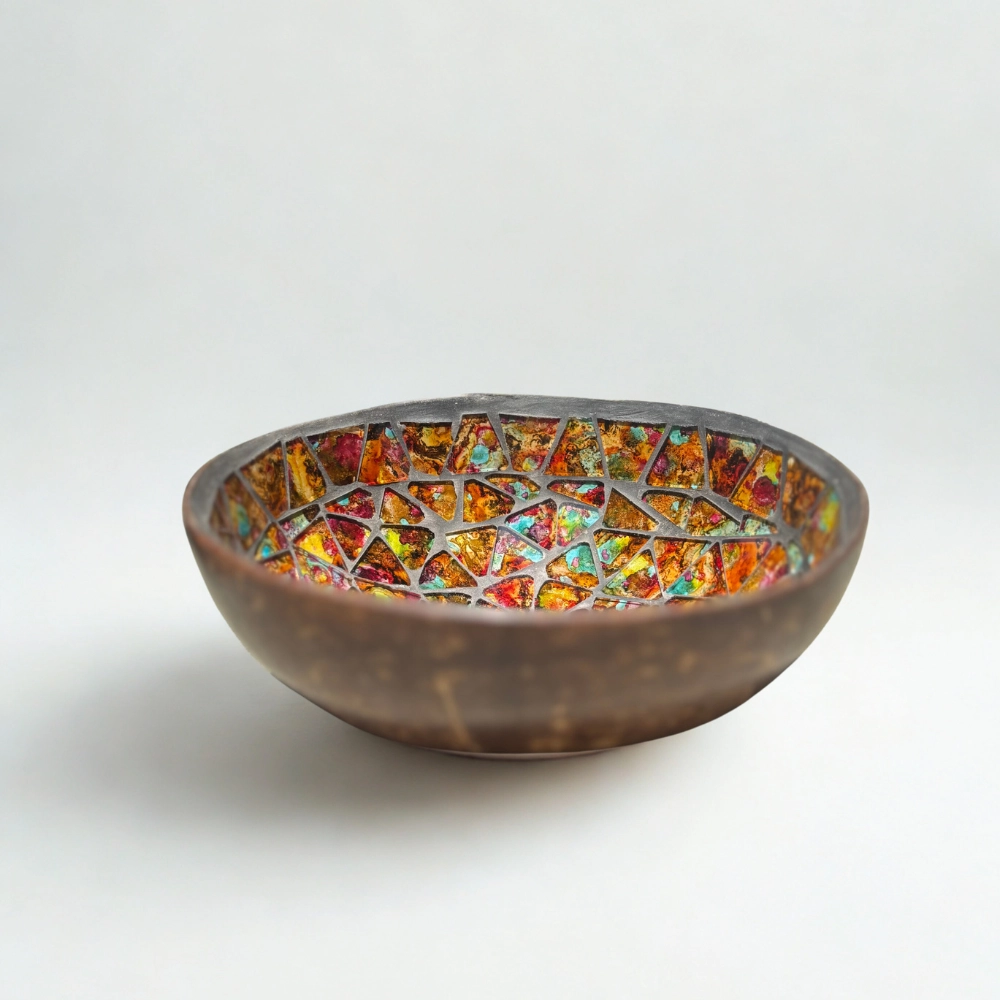 Kézzel készült, kókuszhéj alapú dekorációs darab, amelynek belső felületét aprólékosan illesztett, színes üvegmozaik díszíti. A mozaikdarabok vibráló árnyalatai – piros, narancs, zöld, kék és arany – kaleidoszkópszerű mintázatot alkotnak, mintha egy trópusi naplemente fényei tükröződnének vissza. A külső rész sötét, simára csiszolt kókuszhéj, amely kontrasztot teremt a belső ragyogással. A kissé szabálytalan perem és a természetes anyagok használata minden darabot egyedivé tesz.