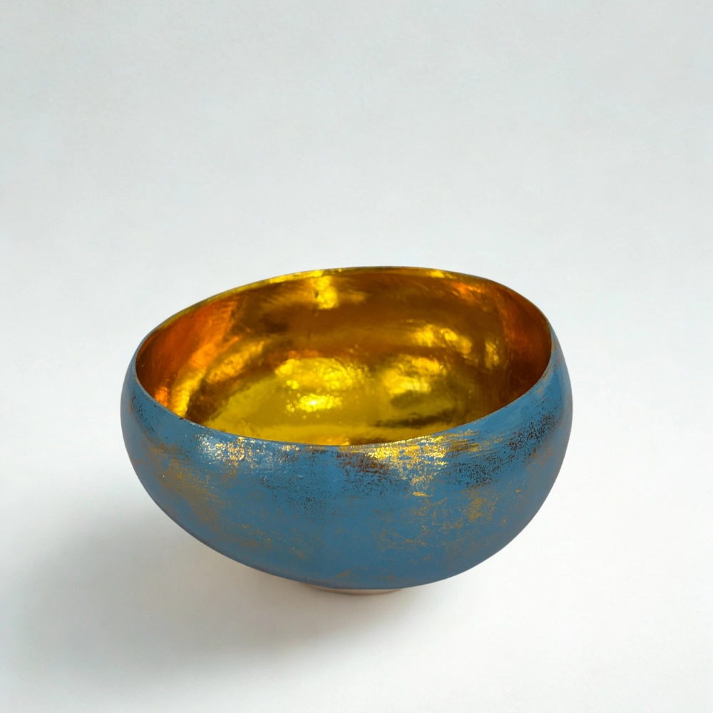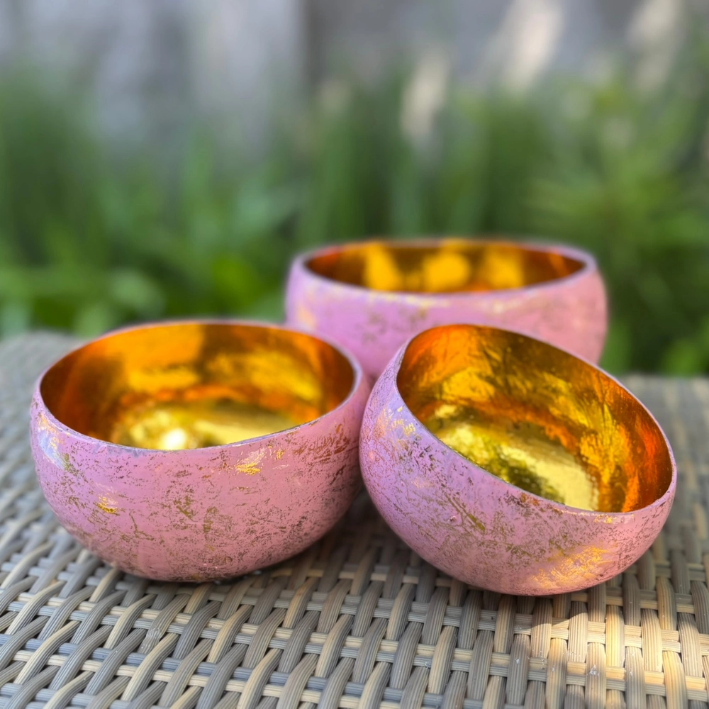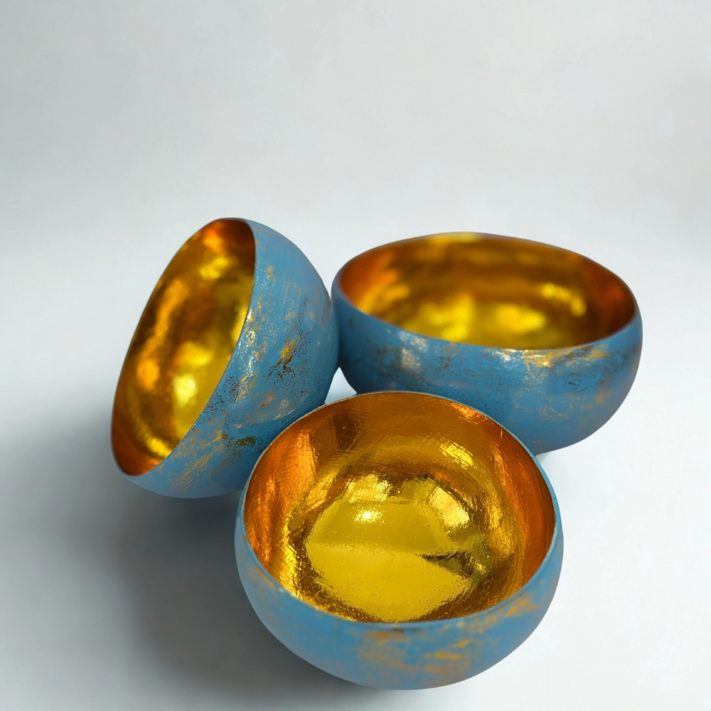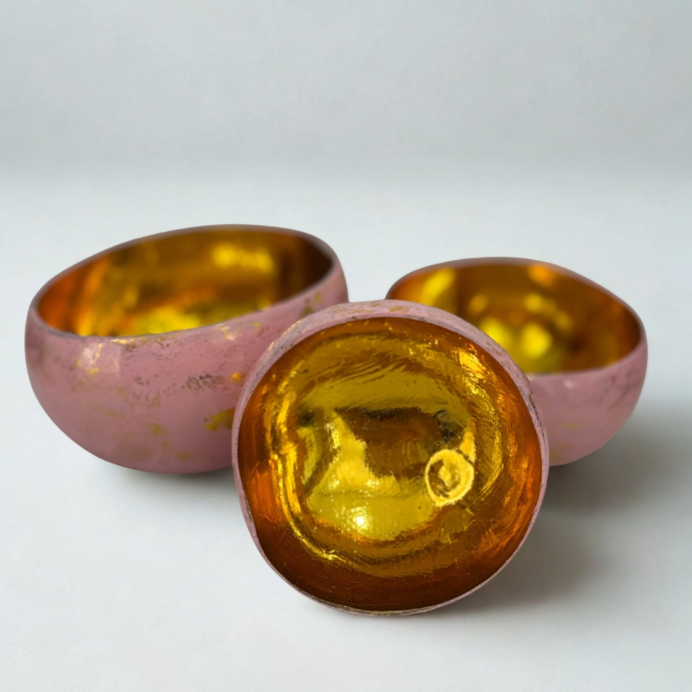 Három kézzel készült kókusztálból áll, amelyek a matt külső és a ragyogó arany belső kontrasztjával varázsolják el a tekintetet. Minden darab egyedi textúrával és aranyozott belső felülettel készül, mintha a tálak belsejében a napfény tükröződne. A külső felületet apró arany foltok díszítik, amelyek a japán kintsugi esztétikát idézik – a tökéletlenség szépségét, a törésből születő ragyogást.